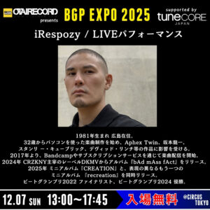 BGP2024優勝者 iRespozy によるLIVEパフォーマンス!iRespozy が生み出す音は単なるリズムの連打に留まらず、緻密に設計された音の質感と空間構築が魅力。冷たく硬い音像の中に、微細な揺らぎや不協和音を忍ばせることで、聴く者を異世界へと誘います。